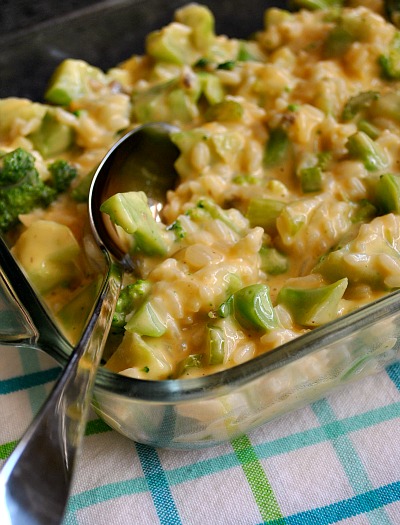 - Cook the broccoli according to package directions but a minute or two less since you will be baking this rice dish. If you using fresh broccoli I usually steam it a bit crisp, but it all depends on how firm you like your broccoli.