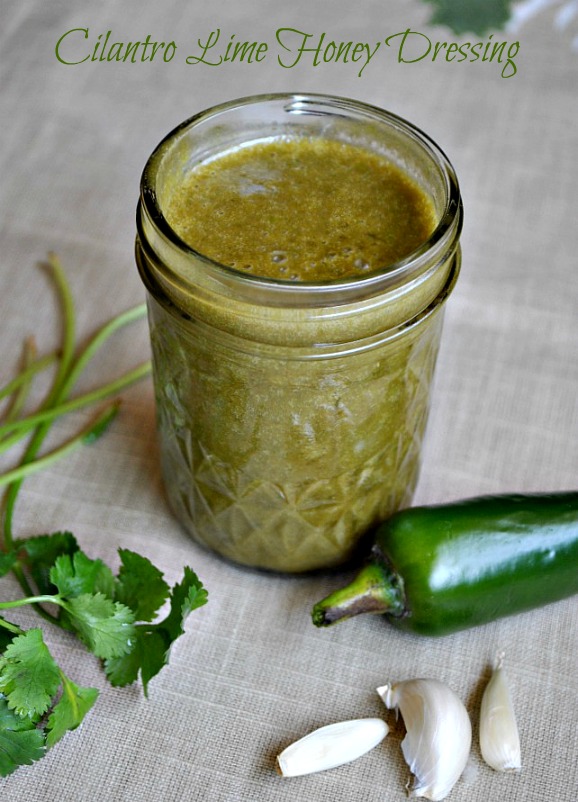 My friend Maria is a great cook and she made this dressing that I’m sharing with you. She first shared it with us on The Mother Huddle but I hadn’t tried it until recently and I thought my readers might love this recipe as much as I did. If you like heat then just leave in the seeds and veins in the jalapeno or take it our if you don’t. I really liked the smokiness from cumin and the fresh taste of lime and cilantro followed by the sweetness from the honey. I know you will love this recipe if you like those flavors so give it a try and come back to see what I’ve made with it.