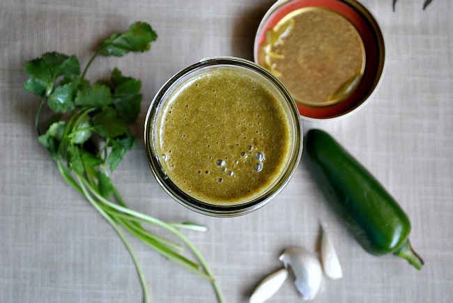 Step 2: With blender on, slowly pour in oil until mixture maintains a dressing like consistency. (If using a food processor, start by pulsing the jalapeno and garlic before adding liquid.) Makes about 1 cup.