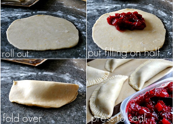 Step 3: On a lightly floured counter roll each ball out into a circle and fill with a heaping tablespoon of filling. Wet your fingers and go around the edge of the dough and fold the dough over. Seal by pressing down with a fork.