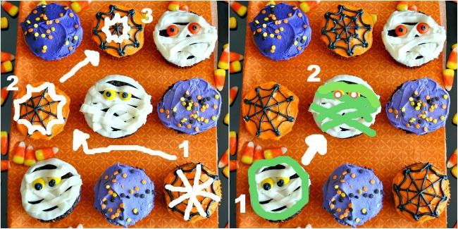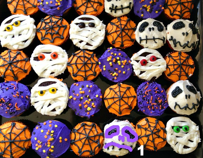 Now for the decorating, that is the fun part and I as usual thought it would take me no time to frost and decorate 75 cupcakes. Well, I barely finished in time to take them to school it took 2/1/2 hours and I know how to decorate, so if your more of a novice give yourself more time than you think you need. I planned on doing 4 designs but my time crunch left me frosting purple cupcakes and adding sprinkles, which is one of the school colors. Okay, since I really wasn’t planning to make this a post I didn’t go through all the steps to decorate but you can easily follow the drawing and directions from the photo below for the spider web, skeleton face and mummy.