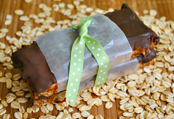 Step 6: Melt the chocolate chips in the microwave safe bowl in 30 second intervals, stirring after each 30 seconds to melt evenly. When the chocolate is melted and smooth dip the bottom side of each granola bar into the chocolate and dry on wax paper with chocolate side up. After chocolate is dried store the bars in a tight closed container.