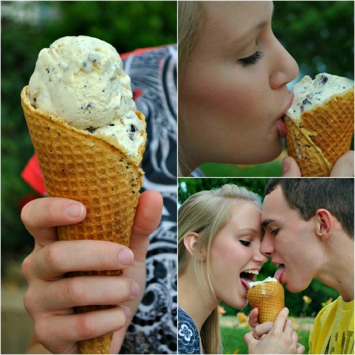That picture of the lovebirds is adorable and I love, love cookies and cream ice cream. Served on a homemade waffle cone–I can’t imagine anything better.