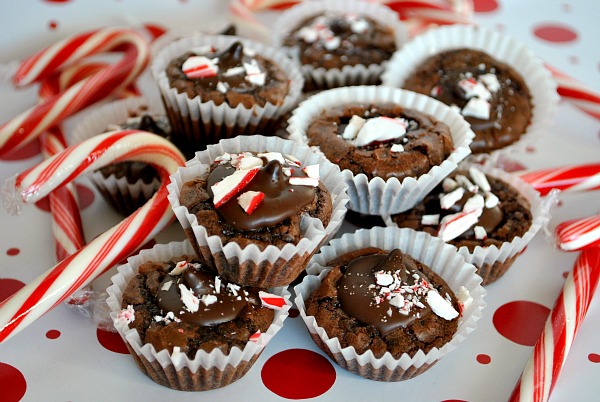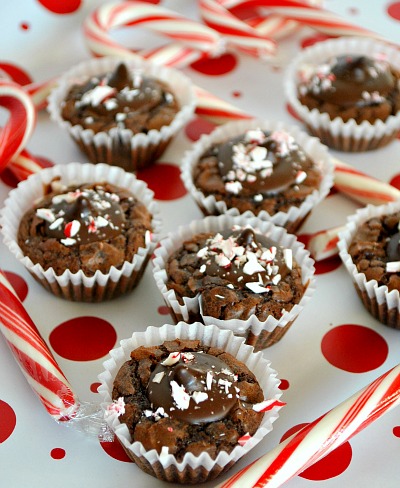 Step 5: Unwrap a candy cane and put into a small sandwich bag, close tightly with the zip-loc. Crush the candy cane in the plastic bag then sprinkle on top of the brownie bites while the chocolate truffles are still warm.